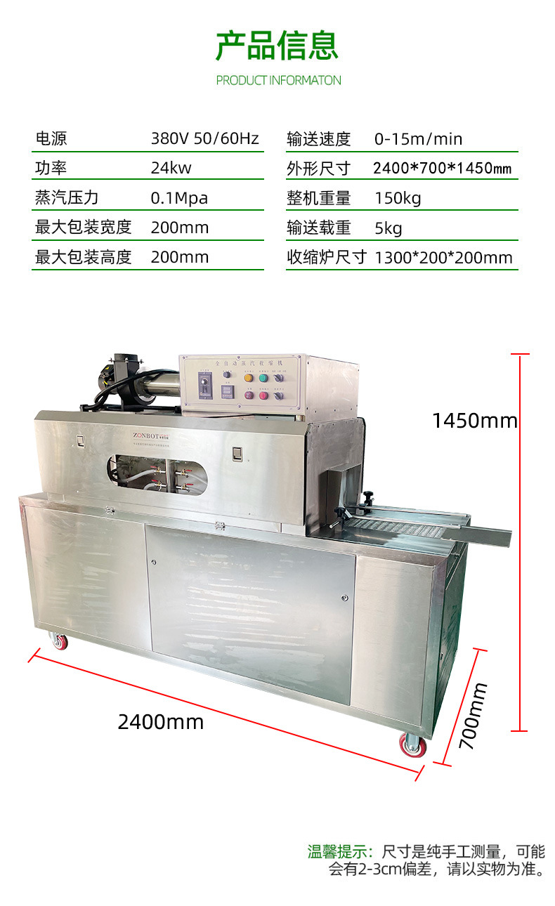 • 環(huán)保節(jié)能:在適當?shù)牟僮鳁l件下,蒸汽收縮機相對比較節(jié)能。而且蒸汽本身是一種相對清潔的熱媒,與一些化學溶劑型的包裝方式相比,對環(huán)境的污染較小。