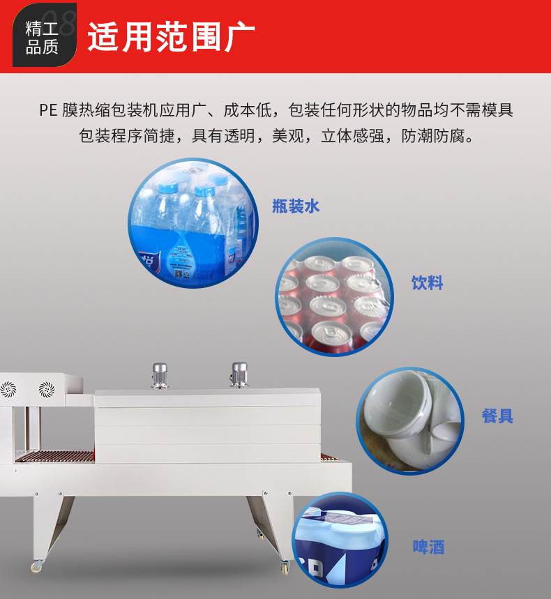 - 適用于對包裝質量和效率要求都很高的大型生產企業和自動化包裝生產線。其優勢在于加熱速度快、均勻性好,能夠有效提高包裝效率和包裝質量。在一些大型的飲料、電子設備等產品的包裝中,遠紅外加熱系統的 PE 熱收縮機可以快速、精準地完成包裝任務。