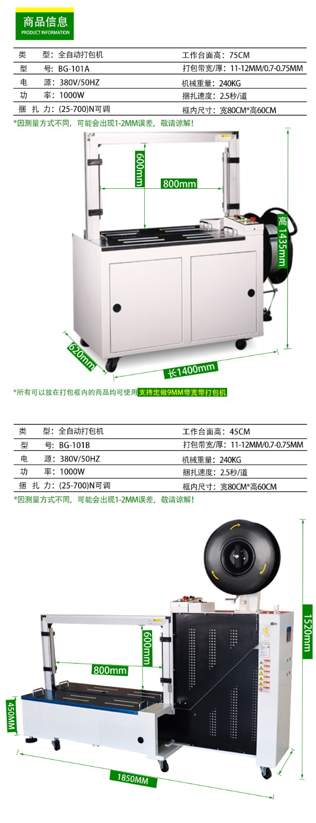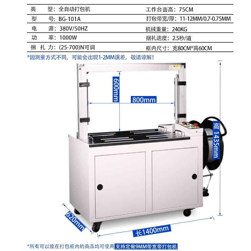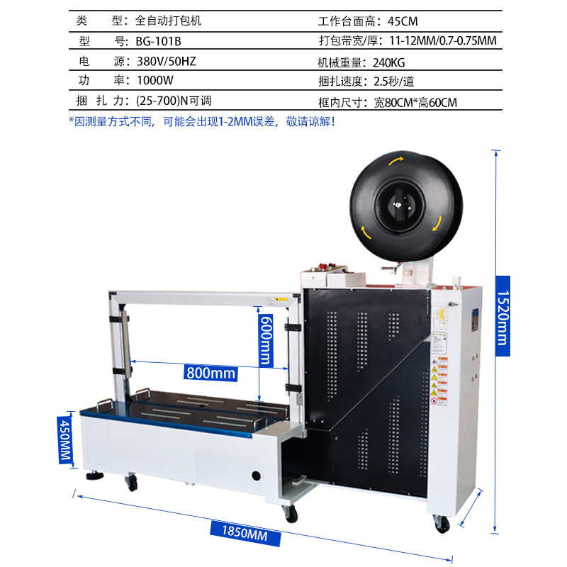 - 尺寸與形狀:如果物品尺寸較大、形狀不規則,需要選擇弓架尺寸大的打包機,如家電、家具等行業,可能需要弓架寬度 800mm 以上、高度 600mm 以上的機型;對于小型物品,如快遞包裹、小型電子產品等,可選弓架尺寸較小的,如寬度 400-600mm、高度 300-400mm 的機型,方便精準打包且設備占地小。