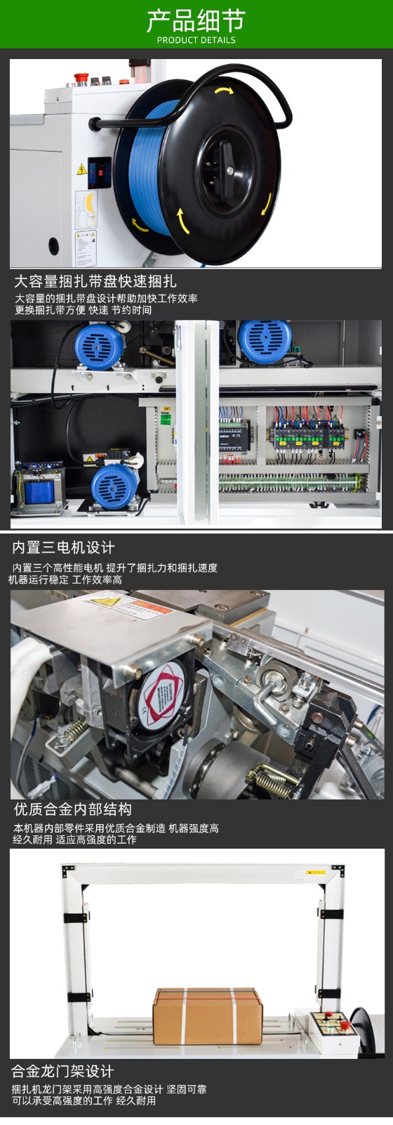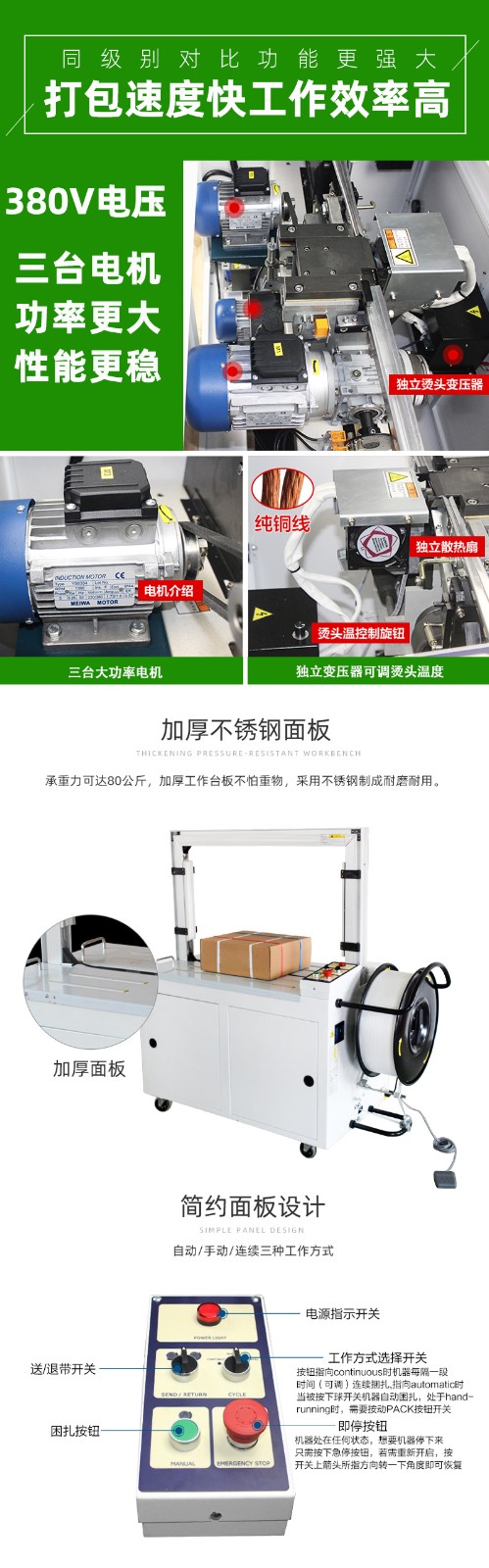 - 自動化程度:若企業追求高度自動化、無人化生產,可選擇具有自動送料、自動定位、自動檢測等功能的全自動電動打包機;若人工輔助打包不影響生產效率,可選擇自動化程度相對較低的機型。