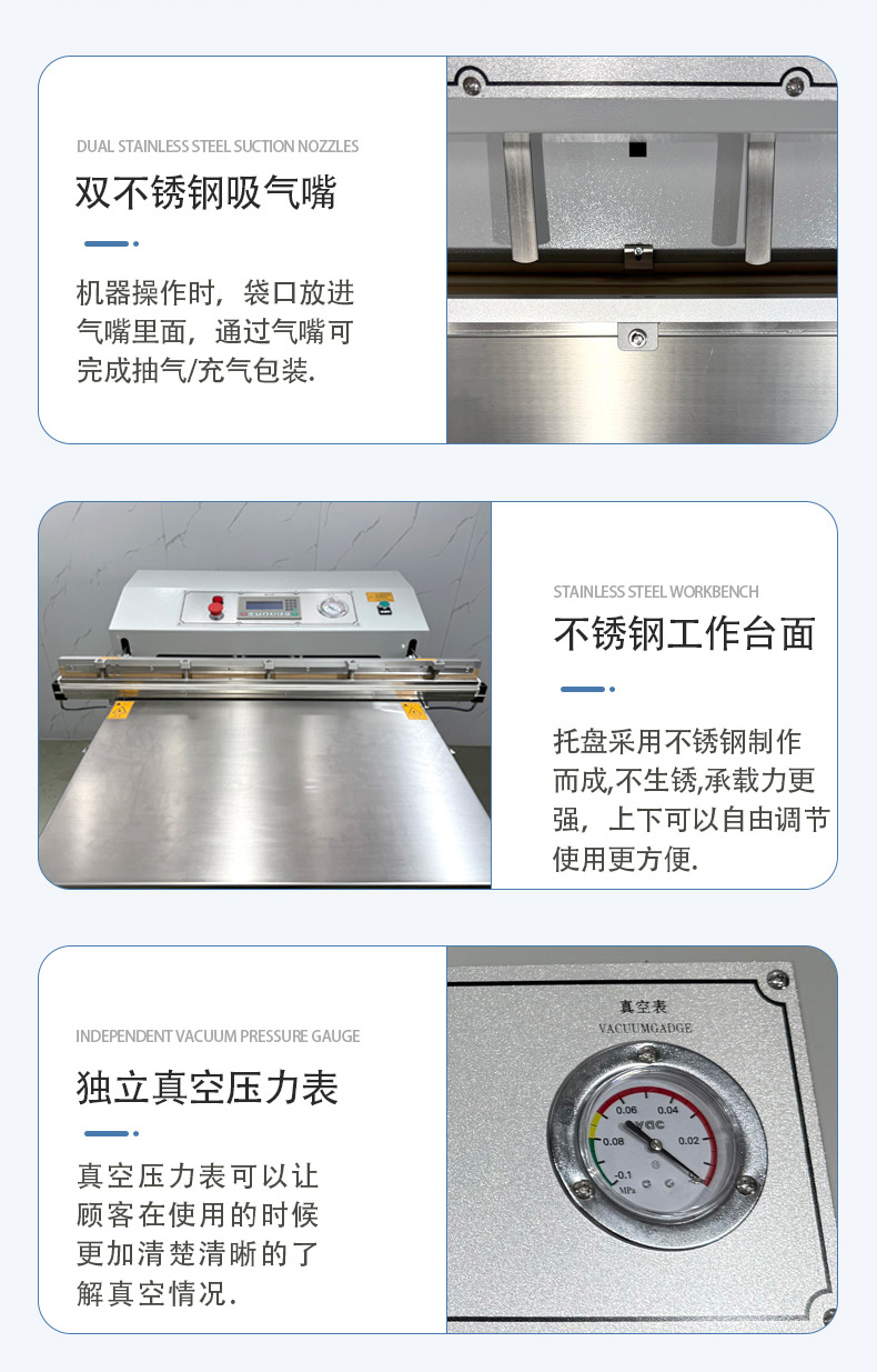 - 真空度與速度:確認設備的極限真空度(通常 - 0.08~-0.095MPa 為宜)和包裝速度(每分鐘 1-3 件,視物品大小而定),避免因性能不足影響效率。