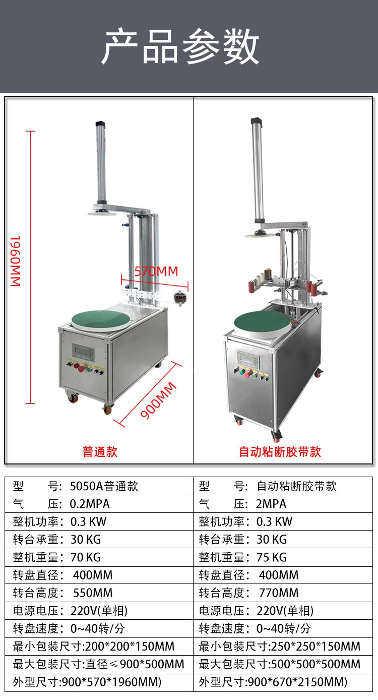 - 貨物纏繞機(jī):主要用于托盤貨物、大型設(shè)備等的包裝,通過旋轉(zhuǎn)工作臺(tái)帶動(dòng)貨物旋轉(zhuǎn),同時(shí)膠帶從上方或側(cè)面進(jìn)行纏繞,如常見的物流倉儲(chǔ)用膠帶纏繞機(jī)。