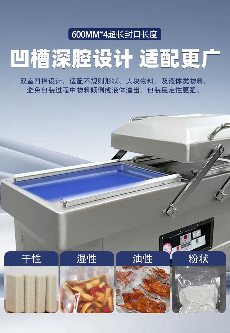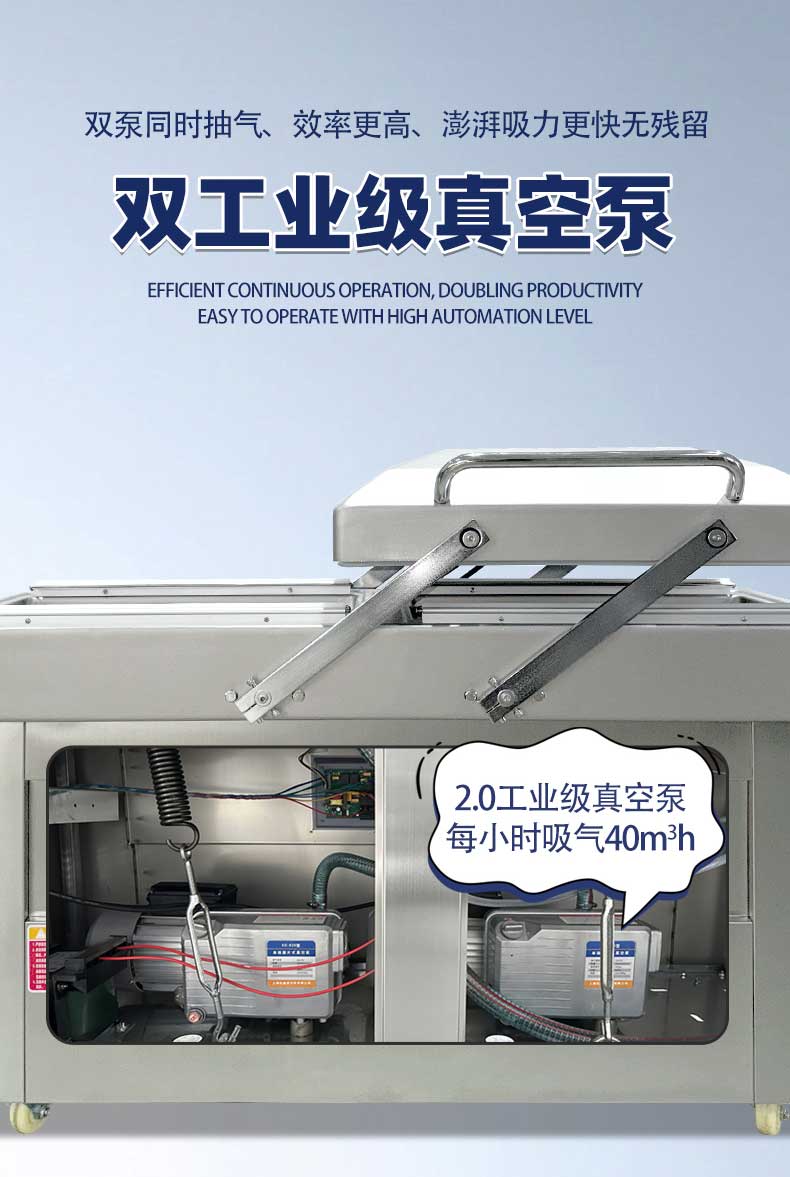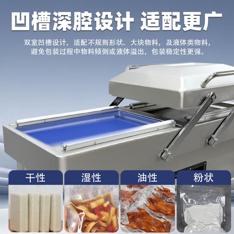 雙室真空包裝機可在真空包裝的基礎上,向包裝袋內充入氮氣、二氧化碳等惰性氣體或混合氣體,起到更好的防腐、防潮、防氧化等保質效果