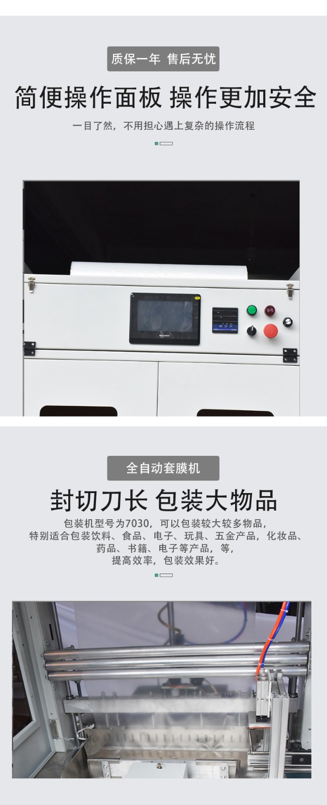 • 自動化控制系統:采用先進的可編程邏輯控制器(PLC)等控制系統,能夠自動調節套膜過程中的各種參數,如薄膜張力、套膜速度、產品輸送速度等。這些參數可以根據不同的產品和包裝要求進行預先設定,設備在運行過程中會自動按照設定值進行工作,保證了包裝質量的穩定性。